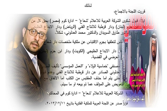 وكانت مجموعة (شعاع) تقدمت بشكوى إلى اتحاد الناشرين العرب، وبعد مداولات استمرت أكثر من عام، صدر قرار اللجنة العربية للملكية الفكرية رقم 12/2013 في تاريخ 11/12/2013 في 8 صفحات، بقبول الشكوى، وتوقيف نشر مصنفي الكتابين "خماسية الولاء" و"العمل المؤسسي" تأليف طارق السويدان ومحمد العدلوني وعدم قبولهما في معارض الكتب العربية، حتى يتم تعويض او مصالحة "شعاع".