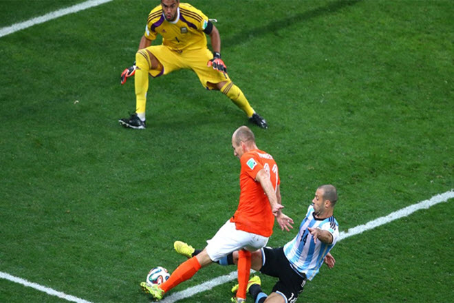 تعملق حارس موناكو الفرنسي سيرخيو روميرو وحمل الأرجنتين للتأهل إلى نهائي كأس العالم للمرة الأولى منذ 1990 والخامسة في تاريخها بفوزها في نصف النهائي النسخة العشرين على هولندا 4-2 بركلات الترجيح بعد انتهاء الوقتين الأصلي والإضافي بالتعادل صفر-صفر الأربعاء على "ارينا دي ساو باولو" في ساو باولو.