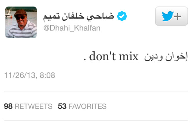 وطالب خلفان في تغريدة أخرى دول الخليج العربي بإدراج ا?خوان كتنظيم إرهابي. وتنبأ: "صفعة جديدة قادمة للاخوان... في الساحة الخليجية تقصم ظهر التنظيم الدولي". واضاف: "عام ألفين وأربعة عشر عاما على ا?خوان أقشر". وغمز من قناة الرئيس المصري المعزول مغردًا: "إخوان ودين don’t mix".