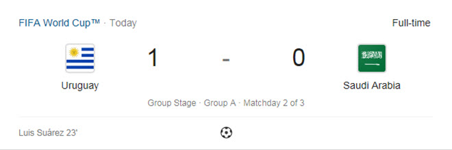 وسجل سواريز "العضاض" هدف التقدم لمنتخب بلاده في الدقيقة 23، بتسديدة من داخل منطقة الجزاء.